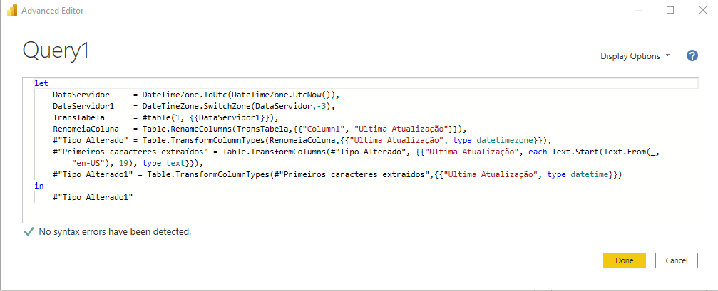 #"Tipo Alterado" = Table.TransformColumnTypes(RenomeiaColuna,{{"Ultima Atualização", type datetimezone}}),