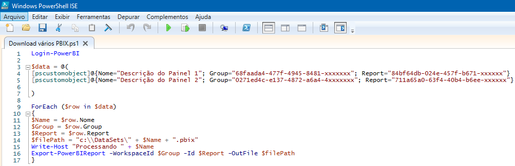 No primeiro passo introduzimos o programa “Windows PowerShell ISE”. Depois vimos como identificar no link do seu painel os códigos dos IDs de “Group” e “Report”
