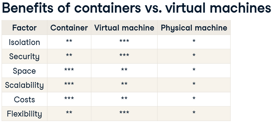 | Isolation | Full OS-level isolation (including the kernel) | OS-level virtualization, sharing the kernel |
